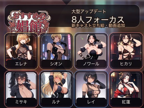 静かな路地裏にひっそり灯る、会員制ラウンジ「おすすめの娼館」。 受付のアイコに案内されながら、会話と選択を通して店に集う女性たちとの距離を少しずつ縮めていく、会話・鑑賞重視のADVです。 本編では、アイコと過ごす7日間のストーリーを収録。 来店を重ねるごとに空気はやわらかく変わり、店の裏側や、そこで働く女性たちの輪郭も少しずつ見えてきます。 …
