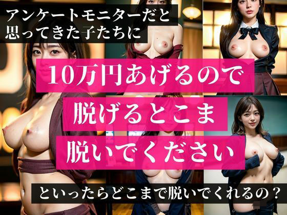 <<作品説明>> 『「奥さん、ぶっちゃけムラムラしてません?」と新婚美女にアンケートを装い声を掛けて10万円の謝礼で脱げるところまで脱いでくださいと言ったらどこまで脱いでくれるの?』 アンケートモニターだと思ってきたが最後!人妻を・・!!! エロさ漂う、様々なシチュエーションをご堪能してください。 内容紹介: 本書は、AIによって生成された美しい女…